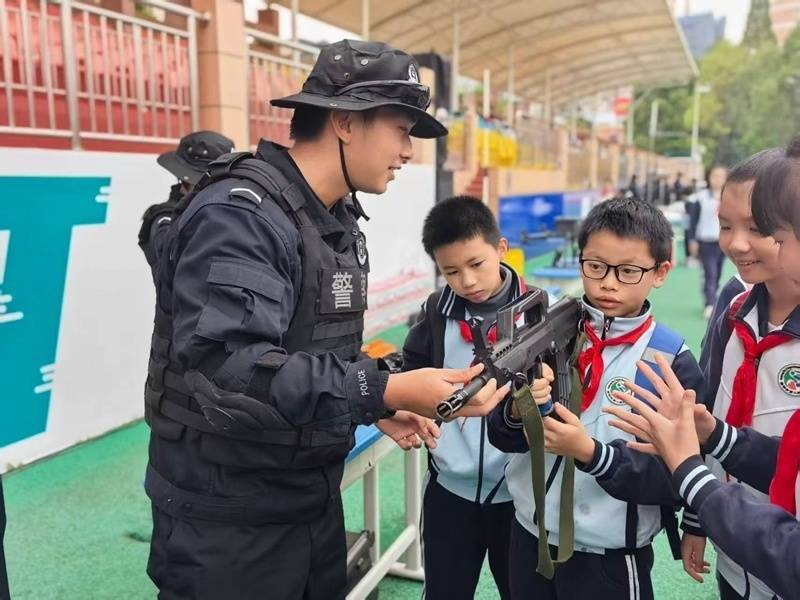 “太酷了!我长大了也想当警察,保护大家的安全!”一个男孩戴着略显宽大的防暴头盔,兴奋地向同伴们展示。