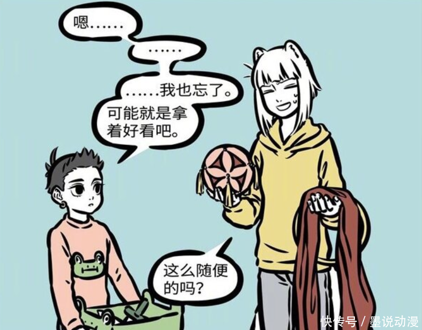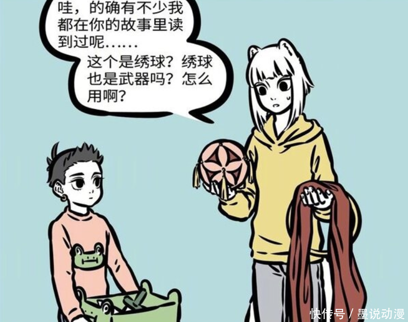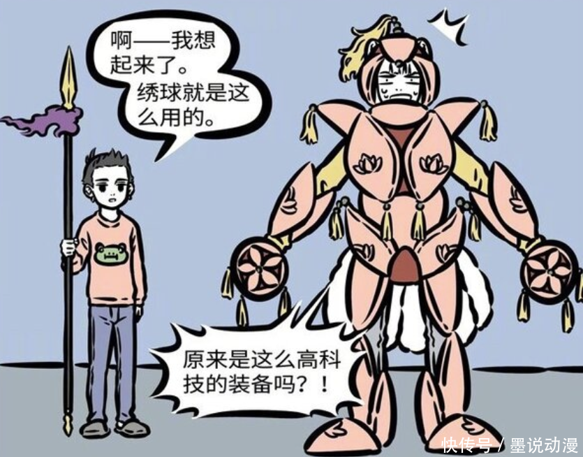 《非人哉》漫画中,哪吒和杨戬都有着很多法宝。哪吒整理法宝之后,发现了许久未使用的火尖枪,只是现在几乎用不到。至于九月,发现哪吒的宝物之中,有颗绣球。按到开关之后,九月因此变身,哪吒也记起来绣球的使用方法。